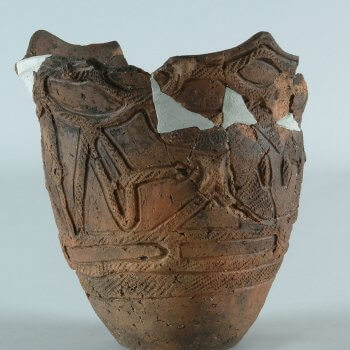 県重宝に指定されている八戸市韮窪(にらくぼ)遺跡出土の狩猟文土器は、縄文時代後期初頭の牛ヶ沢(うしがさわ)式期のもので、胴部には、上から見た4つ足の動物、弓矢、樹木、落とし穴のような文様が横位に展開して描かれている。動物に対して向けられた弓矢には突起があり、装飾をつけた飾り弓とも推測される。4つ足の動物は抽象的な表現のため、具体的にどの動物を表しているかはわからないが、縄文時代に利用される動物のツキノワグマあるいはイノシシと考えられている。狩りの成功を祈る儀式で使用されたのかもしれない。