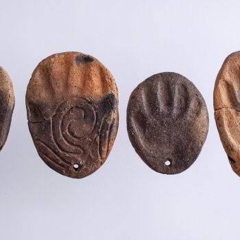 手形・足形付土版は乳幼児の手や足を粘土に押し付けた跡をつけて焼いた土製品であり、北海道から新潟県の限られた時期・地域に分布する。北海道函館市垣ノ島(かきのしま)A遺跡では、縄文時代早期末葉の土坑墓から副葬品として足形付土版が発見されている。青森県など東北地方北部では、十腰内式期に捨て場などからいくつか見つかっている。お墓への副葬品や、特別な祭祀に使われたものと考えられている。