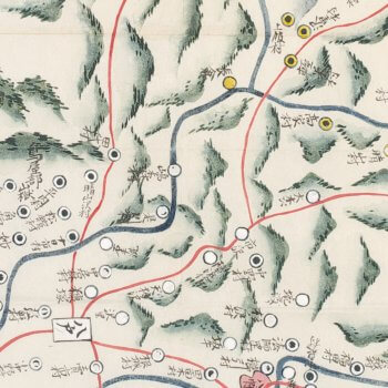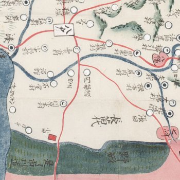 八戸藩領内の村と主要な街道が描かれた絵図。色分けされており赤色は盛岡藩領となっている。