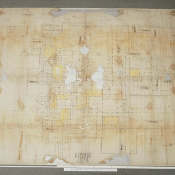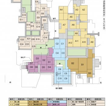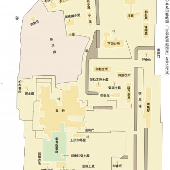 八戸城は天守がない陣屋形式であり、本丸・二の丸・外郭からなる(画像1)。本丸は城郭の北西隅に位置し、規模は東西約150m・南北約200m、四方に土塁と水堀を巡らせていた。南東に大手門、北東に裏門があり、門の内側には番所が設けられた。本丸跡は、現在の三八城神社・三八城公園・県道本八戸停車場線西側の住宅地に相当する。二の丸は本丸の東方から南方を囲むように位置し、城郭の大半を占める。規模は東西約200m・南北約300mの複雑な形をしている。北から南にかけての外周は幅約6mの堀が巡らされ、南は空堀であった。南西に城下への出入口の表門があり、南東の常海丁(じょうかいちょう)には東門、北西の屋敷下口には北門があった。文政10年(1827)、御殿の建替えが始まり、建替え前は古御殿、その後は新御殿といわれ、新御殿は明治4年(1871)の廃藩置県まで使用された。古御殿と新御殿の様子は「古御殿御絵図面(ふるごてんおんえずめん)」(画像2・3)と「新規御普請御殿御絵図面(しんきごふしんごてんおんえずめん)」(画像4・5)に残されている。