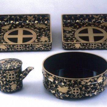 菊牡丹唐草轡十字紋蒔絵漆器・唐草南部鶴紋蒔絵漆器