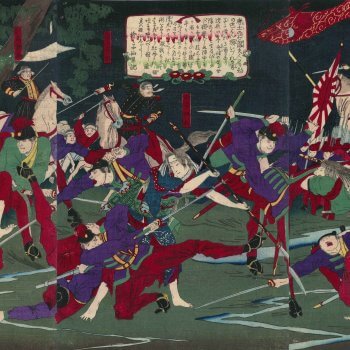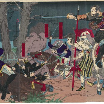 明治10(1877)年2月から約8カ月に及び熊本県・宮崎県・大分県・鹿児島県で展開された国内最後の内戦となる西南戦争は、国民の注目度も高く、双六などを含め300~600点の西南戦争錦絵が作られた。この頃はまだ江戸から続く浮世絵人気は高く、当時流行の赤・紫・緑が多用され、芝居がかった如何にも浮世絵風の作品が多い。なかには価格が記載されているものもあり、多く作られた3枚組は6銭〔現在の約1500円〕程度であった。