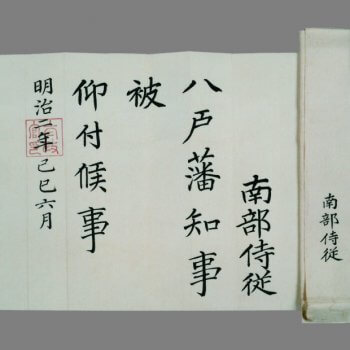 明治2年(1869)版籍奉還が行われ、全国の藩主は領地と領民を朝廷へ返還することになった。藩主は旧領地の藩知事〔知藩事とも〕に任命され、そのまま藩政に当たった。画像1は版籍奉還の聴許書(ちょうきょしょ)、画像2は知藩事任命の辞令で、どちらも9代藩主南部信順(なんぶのぶゆき)宛である。