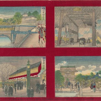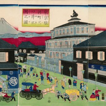 「東京築地ホテル館表掛之図」の高さ18mの巨大な和洋折衷建築〈築地ホテル館〉は、日本初の外国人専用ホテルとして明治元年に竣工すると、100点超の文明開化絵が作られた。一方、「東京駿河町三ツ井正写之図」には、江戸の象徴日本橋の越後屋〔現日本橋三越本店〕と新たな顔の為替バンク三井組〔現三井本館〕が並ぶ日本橋の新景観を富士山をバックに描いている。因みに、築地ホテル館と為替バンク三井組は共に、清水建設二代目清水喜助の代表的建築物である。