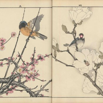 そんな中、禁裏御用の仕事や町衆の需要に応じてきた京都の画家たちは、博覧会への肉筆画出展の他、伝統工芸品の下絵や図案制作を行うようになり、竹内栖鳳(たけうちせいほう)・今尾景年(いまおけいねん)・幸野楳嶺(こうのばいれい)など錚々たる画家たちが参加した。伝統工芸品は、美術作品へと一層高められ国内外で高い評価を受ける一方、化学染料や機械化と融合し伝統産業へと発展していった。『景年花鳥画譜』は、京都画壇の中心画家の一人今尾景年の花鳥絵手本を、京友禅の老舗・千總(ちそう)が国内外へ刊行した版本。