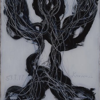 和井田の作品は墨象(ぼくしょう)と呼ばれる分野の書で、これは文字が持つ意味を多彩な手法と造形で表現したものである。たとえば、昭和28年(1953)制作の《子供》では、「子」の象形文字の形に子どものイメージを重ねて表現している。ガラス板に黒いアクリル絵の具で線を書き、さらに絵の具を削りとるように引っ掻くことで鋭い線を生み出しており、身体の柔らかさと力強さが感じられる作品である。